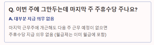 Q2. 이번 주에 그만두는데 마지막 주 주휴수당 주나요? A2. 행정해석 변경으로 인해, 마지막 근무주에 개근했더라도 다음 주 근무 예정이 없다면 주휴수당 지급 의무가 없다고 보는 경우가 많습니다. (단, 월급제 근로자는 이미 월급에 포함되어 있어 공제하지 않음이 원칙입니다.)
