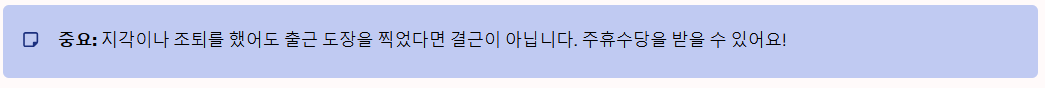 ⚠️ 주의: 지각이나 조퇴를 했더라도 출근 도장을 찍었다면 결근이 아니므로 주휴수당을 받을 수 있습니다.