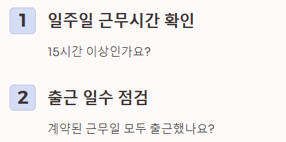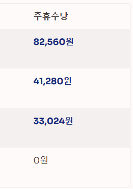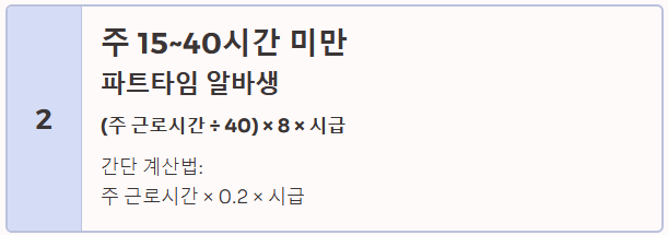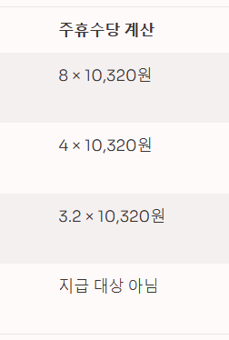 - 계산법: (1주 총 근로시간 ÷ 40시간) × 8시간 × 시급
