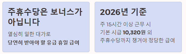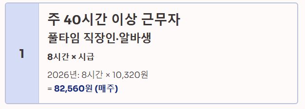 - 2026년 기준 금액: 8시간 × 10,320원 = 82,560원 (매주)