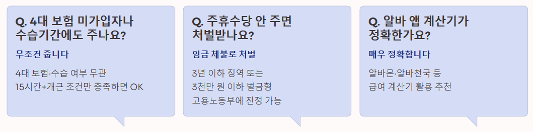 Q3. 4대 보험 미가입자나 수습기간에도 주나요? A3. 네, 무조건 줍니다. 4대 보험 가입 여부나 수습 기간 여부와 상관없이, 근로기준법상 조건(15시간+개근)만 맞으면 반드시 지급해야 합니다.