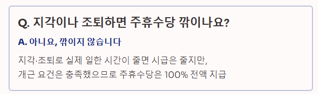 Q1. 지각이나 조퇴를 몇 번 했는데 주휴수당 깎이나요? A1. 아니요, 깎이지 않습니다. 지각/조퇴를 해서 실제 일한 시간이 줄어들어 그만큼 시급은 줄 수 있지만, 개근 요건은 충족한 것이므로 주휴수당은 100% 전액 지급되어야 합니다.