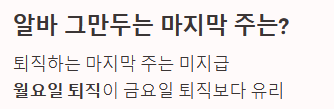 Q5. 알바 그만두는 마지막 주에도 주휴수당을 주나요? 최근 행정해석에 따르면, **퇴직하는 마지막 주(그다음 주 근무가 예정되지 않은 주)**에는 주휴수당이 발생하지 않는 것이 원칙입니다. 따라서 퇴사일을 정할 때 금요일까지 일하고 퇴사하기보다 월요일을 퇴직일로 잡는 것이 유리할 수 있습니다.