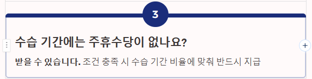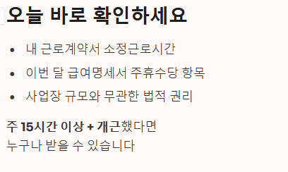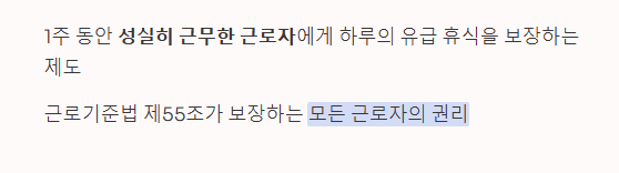 - 금액: 하루치 소정근로시간에 대한 임금을 별도로 지급 (보통 시급의 20% 효과)