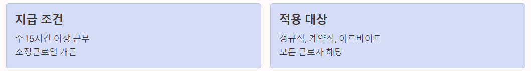 - 정의: 1주 동안 규정된 근무일수를 다 채운 근로자에게 유급 주휴일(돈 받고 쉬는 날)을 주는 제도
