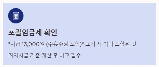 포괄임금제 확인 채용 공고에 "시급 13,000원 (주휴수당 포함)"이라고 적혀 있는 경우가 있습니다. 이때는 시급 안에 이미 주휴수당이 녹아져 있는 것이므로 별도로 요구할 수 없습니다. 단, 계산해 봤을 때 최저시급 기준 주휴수당 포함 금액보다 낮다면 위법입니다.