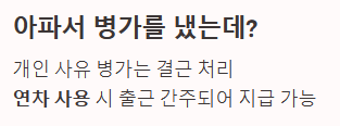 Q4. 아파서 병가를 냈는데 받을 수 있나요? 개인적인 사유로 병가를 냈다면 원칙적으로 '결근' 처리가 되어 해당 주는 주휴수당이 발생하지 않습니다. 하지만 연차를 사용하여 쉬었다면 출근한 것으로 간주되어 받을 수 있습니다.