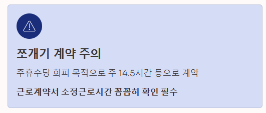 쪼개기 계약 주의 일부 사업장에서는 주휴수당 지급을 피하기 위해 근무 시간을 주 14.5시간 등으로 계약하는 일명 '쪼개기 계약'을 하기도 합니다. 근로계약서 작성 시 소정근로시간을 꼼꼼히 확인하세요.