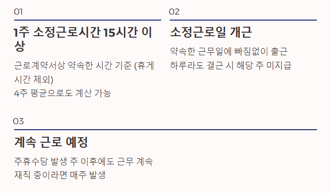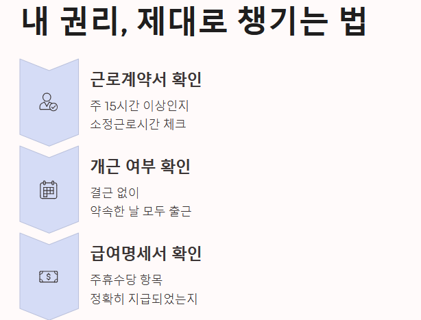 "나도 받을 수 있을까?" 궁금하다면 아래 3가지 조건만 확인하면 됩니다. 이 조건들이 모두 충족되어야 주휴수당이 발생합니다.