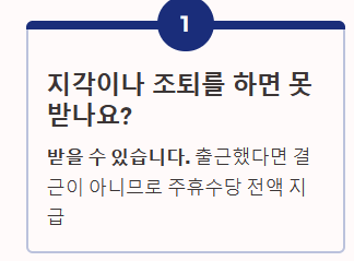 Q1. 지각이나 조퇴를 하면 못 받나요? 아닙니다. 지각이나 조퇴를 했더라도 회사에 출근했다면 '결근'이 아닙니다. 따라서 지각/조퇴로 인한 급여 공제는 있을 수 있어도, 주휴수당은 정상적으로 전액 지급받아야 합니다.