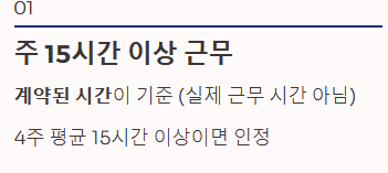 - 근로 시간: 1주일에 소정근로시간이 15시간 이상이어야 합니다.