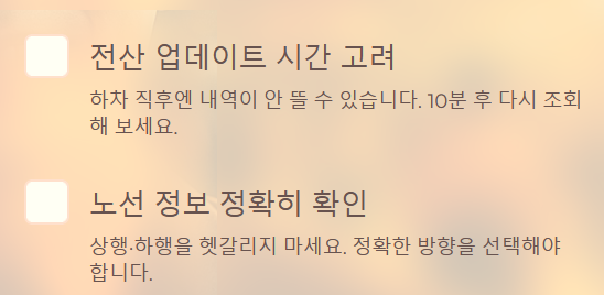 - 정보 선택: 화면에 보이는 날짜, 시간대, 그리고 내가 탔던 호선(상행/하행)을 클릭합니다.