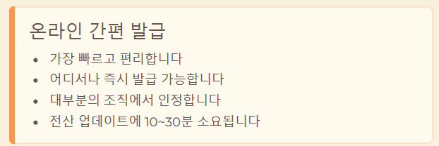 - 온라인(간편) 발급: 가장 빠르고 편리합니다. 대부분의 기업과 학교에서 인정해 줍니다. 다만, 전산에 지연 시간이 업데이트되는 데 10분~30분 정도 소요될 수 있습니다. (내리자마자 바로 조회가 안 될 수도 있음)