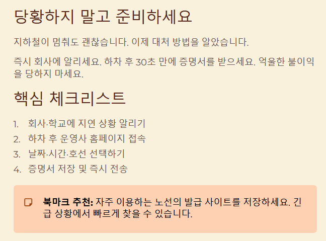 지하철이 멈추는 순간, 당황해서 발만 동동 구르지 마세요. 어차피 늦어질 상황이라면 침착하게 회사나 학교에 현재 지하철 고장으로 지연 중입니다라고 메시지를 보낸 뒤, 하차 후에 스마트폰으로 간편지연증명서를 캡처하면 됩니다.