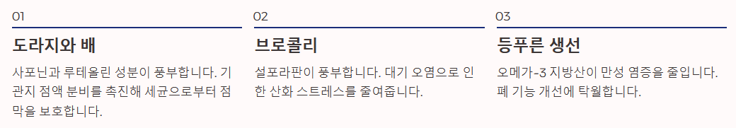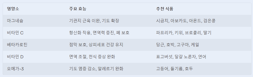 | 오메가-3 | 기도 염증 감소, 알레르기 완화 | 고등어, 들기름, 호두 |