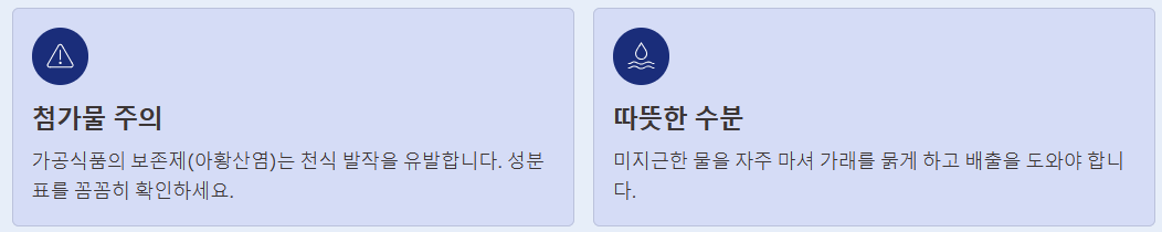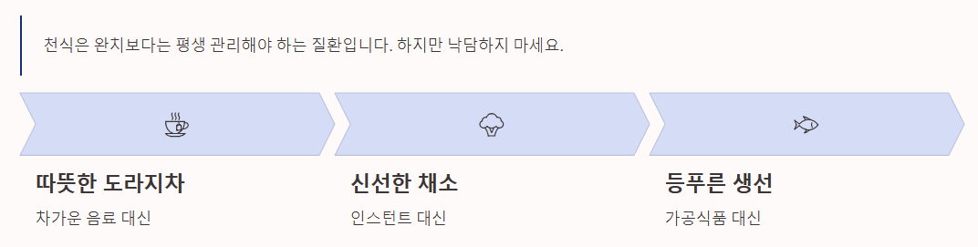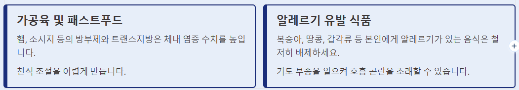 - 첨가물 주의: 가공식품에 들어가는 특정 보존제(아황산염 등)는 천식 발작을 유발하는 주요 트리거가 될 수 있습니다.