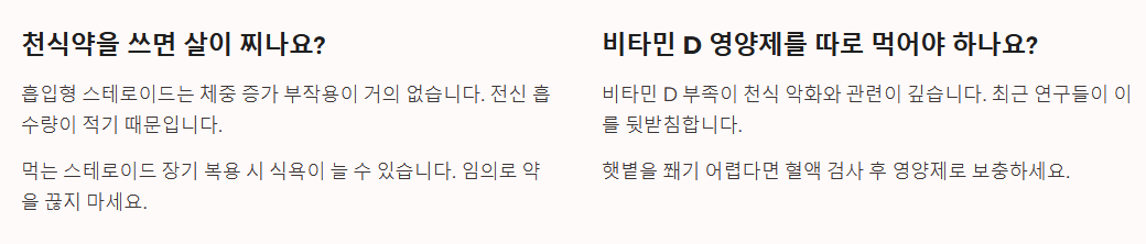 최근 연구들에 따르면 비타민 D 부족이 천식 악화와 관련이 깊다고 합니다. 햇볕을 쫴기 어렵다면 혈액 검사 후 부족 시 영양제로 보충하는 것이 호흡기 면역 관리에 도움이 됩니다.