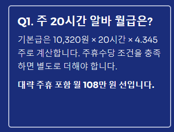 A1. 주 20시간 근무 시 기본급은 10,320원 × 20시간 × 4.345주로 계산하며, 여기에 주휴수당 조건을 충족하면 주휴수당을 별도로 더해야 합니다. 대략적으로 주휴 포함 월 108만 원 선이 됩니다.