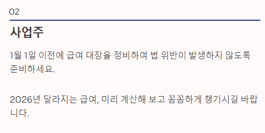 근로자는 본인의 근로계약서가 2026년 기준에 맞게 갱신되었는지 확인해야 하며, 사업주는 1월 1일 이전에 급여 대장을 정비하여 법 위반이 발생하지 않도록 미리 준비하는 것이 중요합니다. 2026년 달라지는 급여, 미리 계산해 보고 꼼꼼하게 챙기시길 바랍니다.