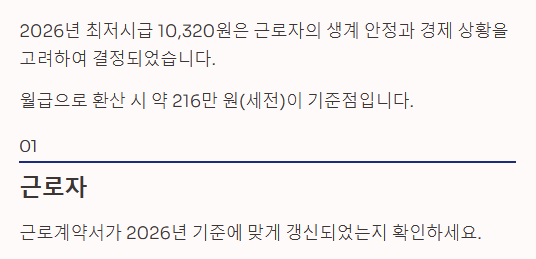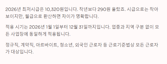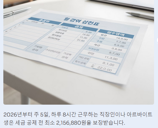따라서 2026년부터 주 5일, 하루 8시간을 꼬박 근무하는 직장인이나 아르바이트생이라면, 세금 공제 전 최소 2,156,880원을 보장받아야 합니다.