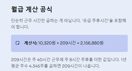 - 계산식: 10,320원 × 209시간 = 2,156,880원