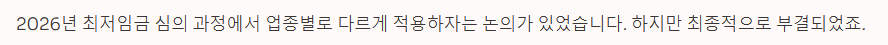 업종별 차등 적용 여부 2026년 최저임금 심의 과정에서 업종별로 다르게 적용하자는 논의가 있었으나, 최종적으로 부결되었습니다. 따라서 편의점, 택시, 숙박업 등 업종과 관계없이 모든 사업장은 10,320원을 준수해야 합니다.