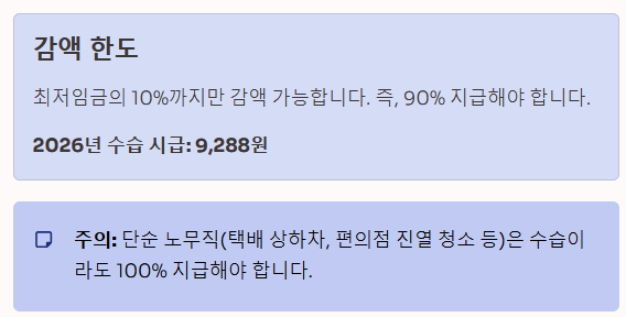 - 감액 한도: 최저임금의 10%까지만 감액 가능 (즉, 90% 지급)