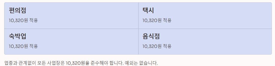 - 적용 범위: 업종, 지역 구분 없이 모든 사업장에 동일하게 적용 (단일 최저임금)