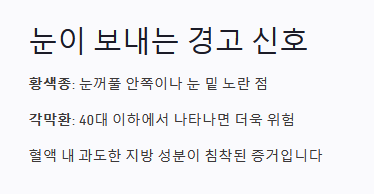 - 눈 주변 변화: 눈꺼풀에 노란색 지방 덩어리(황색종)가 생기거나 검은자위 주변에 흰 테두리가 생깁니다.