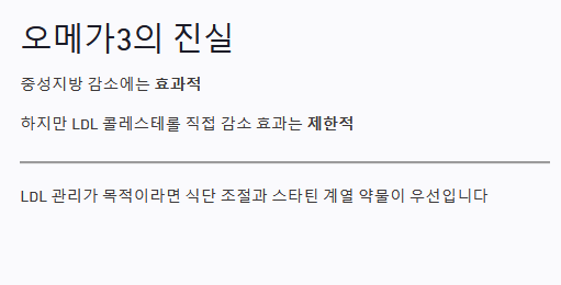 - 오메가3는 중성지방을 낮추는 데는 효과적이지만, 나쁜 콜레스테롤(LDL)을 직접적으로 낮추지는 못합니다. LDL 관리가 목적이라면 식단 조절과 스타틴 계열의 약물 치료가 우선입니다.