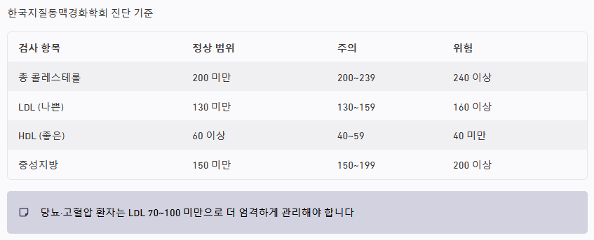 참고: 당뇨병이나 고혈압, 심장질환이 있는 분들은 위 표의 정상 기준보다 훨씬 더 엄격하게(LDL 70~100 미만) 관리해야 합니다.