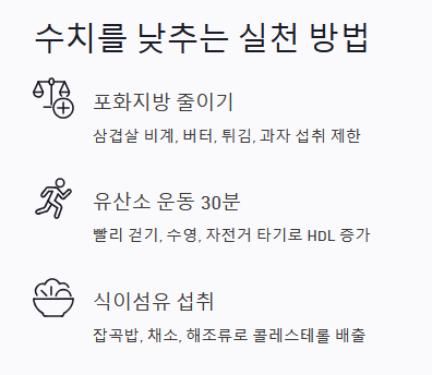 ① 포화지방과 트랜스지방 줄이기 콜레스테롤 수치를 올리는 주범은 지방입니다. 삼겹살 비계, 갈비, 버터, 믹스커피(프림), 과자, 튀김 섭취를 줄이세요. 계란 노른자나 새우 같은 콜레스테롤 함유 식품보다는 포화지방(기름기)을 줄이는 것이 훨씬 중요합니다.