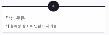 ⑤ 만성 두통과 어지러움 뇌로 가는 혈관(경동맥 등)이 좁아지면 뇌 혈류량이 줄어들어 머리가 무겁고 어지러운 증상이 나타날 수 있습니다. 이를 단순 빈혈로 착각하고 방치하면 뇌졸중으로 이어질 수 있어 위험합니다.
