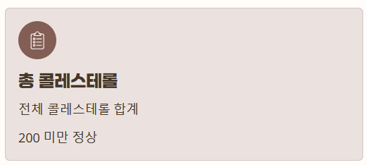 | 총 콜레스테롤 | 200 미만 | 200 ~ 239 | 240 이상 |