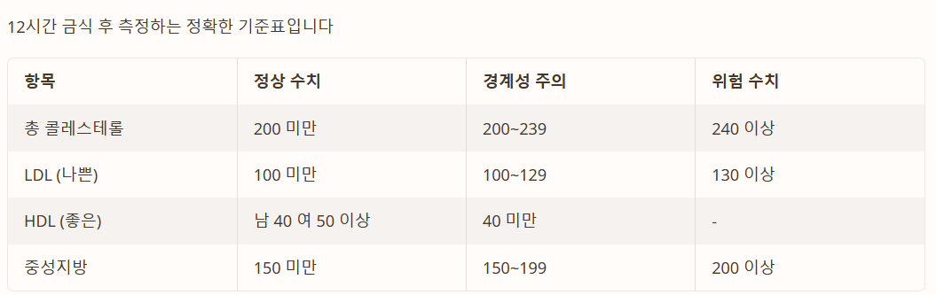 콜레스테롤 검사는 보통 12시간 금식 후 진행하며, 측정 항목은 총 4가지입니다. 아래 표를 통해 각 항목별 정상수치와 위험 기준을 정확히 확인하세요.