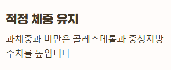 - 적정 체중 유지: 과체중이나 비만은 콜레스테롤과 중성지방 수치를 높이므로, 적정 체중을 유지하는 것이 중요합니다.