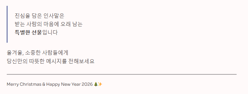 - 위로와 응원: "한 해 동안 고생 많았어. 따뜻한 휴식으로 충전하고, 2026년에는 원하는 모든 것을 이루길 응원할게."