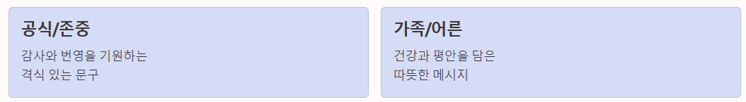 - 가족/어른: 건강, 평안, 사랑 등 가족의 행복을 기원하는 따뜻한 메시지