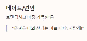 | 데이트/연인 | 올겨울 나의 산타는 바로 너야. 사랑해! 최고의 하루를 선물해 줘서 고마워. | 로맨틱하고 애정 가득한 톤 |