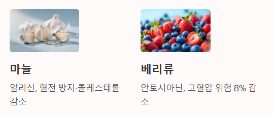 | 칼슘 | 혈관 수축/이완 조절 | 우유, 요거트, 멸치, 브로콜리 |