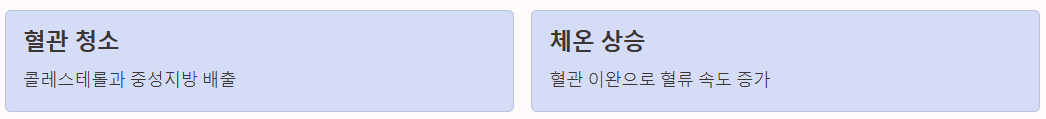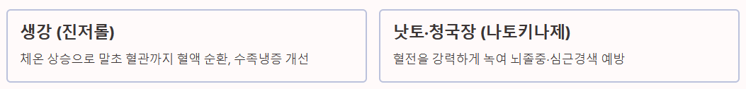 - 체온 상승: 체온이 올라가면 혈관이 이완되어 혈류 속도가 빨라집니다. 몸을 따뜻하게 하는 성질의 음식이 좋습니다.