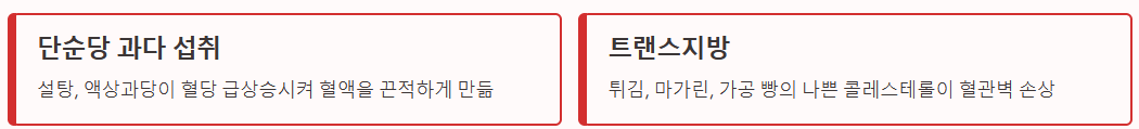 - 트랜스지방: 튀김, 마가린, 가공 빵에 든 트랜스지방은 나쁜 콜레스테롤(LDL)을 높이고 혈관벽에 염증을 일으킵니다.