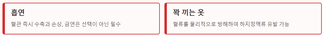 - 흡연: 담배를 피우면 혈관이 즉시 수축하고 손상됩니다. 혈액순환 장애가 있다면 금연은 선택이 아닌 필수입니다.
