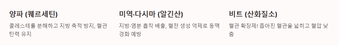 | 산화질소 | 혈관 확장, 혈압 조절 | 비트, 상추, 셀러리 |
