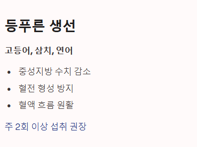 | 오메가-3 | 혈행 개선, 중성지방 감소 | 고등어, 연어, 들기름, 호두 |