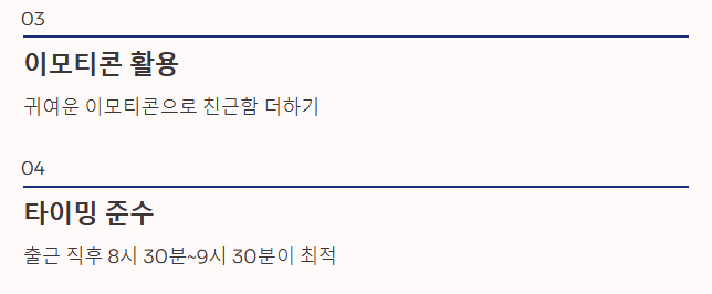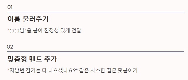 - 이름 불러주기: "즐거운 화요일 되세요"보다는 "OO님, 즐거운 화요일 되세요"가 훨씬 진정성 있게 느껴집니다. 단체 문자가 아니라는 느낌을 줍니다.