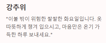 | 강추위 | "이불 밖이 위험한 쌀쌀한 화요일입니다. 옷 따뜻하게 챙겨 입으시고, 마음만은 온기 가득한 하루 보내세요. 감기 조심하세요!" | 따뜻함, 건강, 온기 |