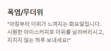 | 폭염/무더위 | "아침부터 더위가 느껴지는 화요일입니다. 시원한 아이스커피 한 잔으로 더위를 날려버리시고, 지치지 않는 하루 보내세요!" | 시원함, 활력, 충전 |