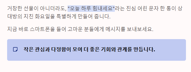 | 응원 강조 | "당신의 화요일을 응원합니다. 오늘 하루도 주인공은 바로 당신입니다!" | 자존감, 응원, 격려 |