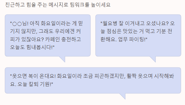 - "OO님! 아직 화요일이라는 게 믿기지 않지만, 그래도 우리에겐 커피가 있잖아요? 카페인 충전하고 오늘도 힘내봅시다! 파이팅!"